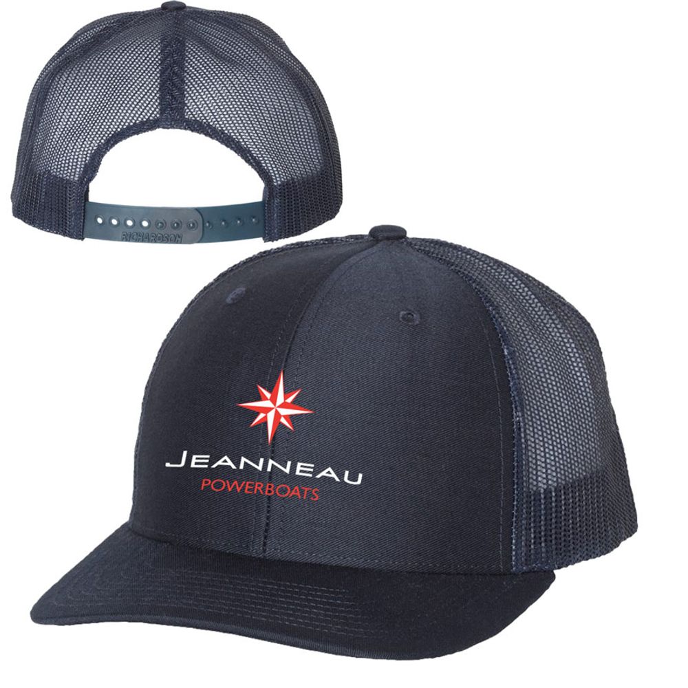 The Richardson Snapback Trucker Cap has a classic structured fit, adjustable plastic snapback, and a curved visor that matches its underbill. Features a Jeanneau Powerboats front embroidered logo. Size: OSFA